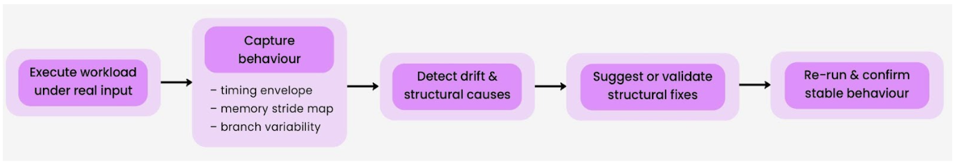 Behaviour-aware tooling makes this measurable. By capturing iteration-to-iteration timing stability, memory-touch patterns, and branch behaviour under realistic workloads, such systems reveal exactly where structural drift occurs and guide refactoring toward deterministic loop shapes.