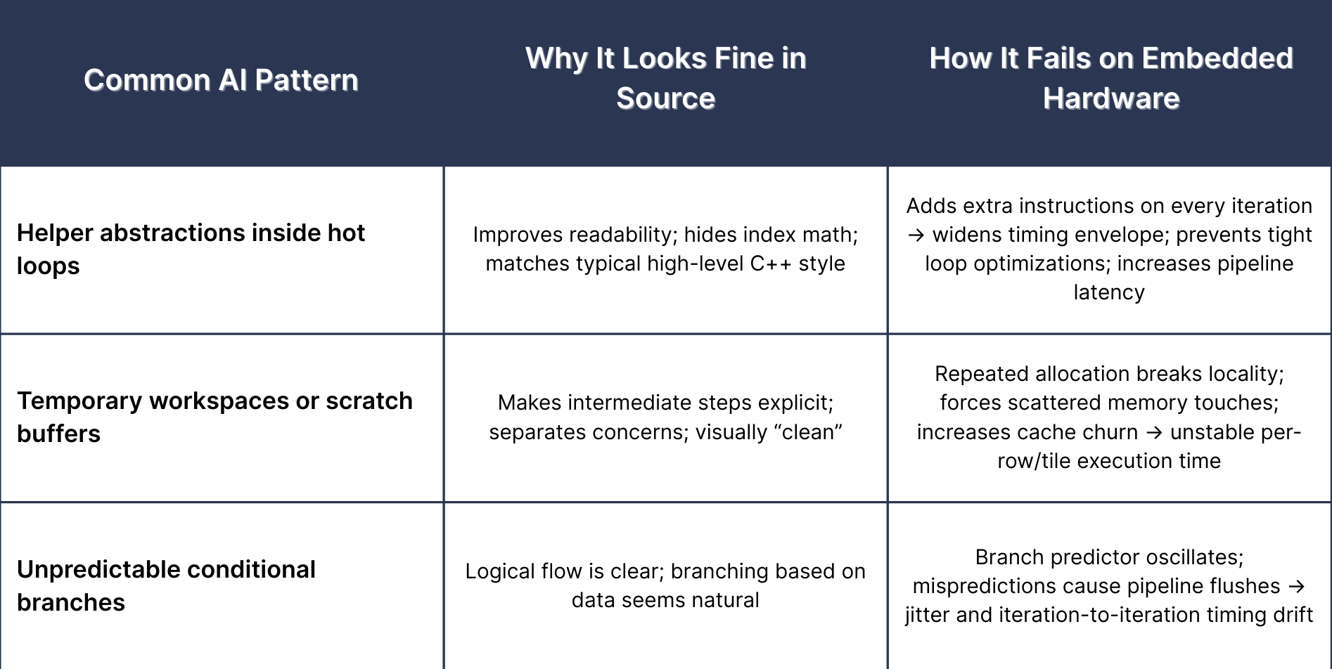 Embedded workloads expose behavioural weaknesses that the source code does not reveal. The gap appears once the code enters tight loops and real-time paths where predictable memory access, branch stability, and consistent iteration cost matter as much as correctness. AI-generated structures often drift here because the model optimizes for clarity rather than execution behaviour. Three patterns show up repeatedly in embedded pipelines: