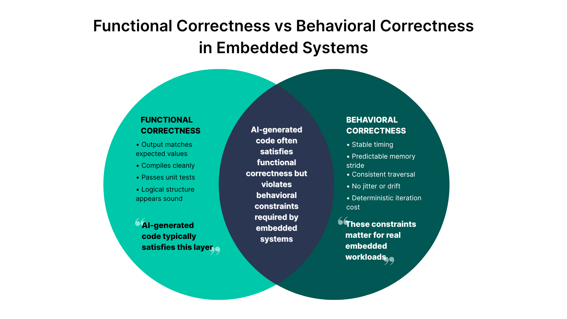 The distinction can be summarized visually. While AI-generated code often meets functional expectations, embedded systems demand a deeper level of behavioural correctness that statistical generation does not address.
